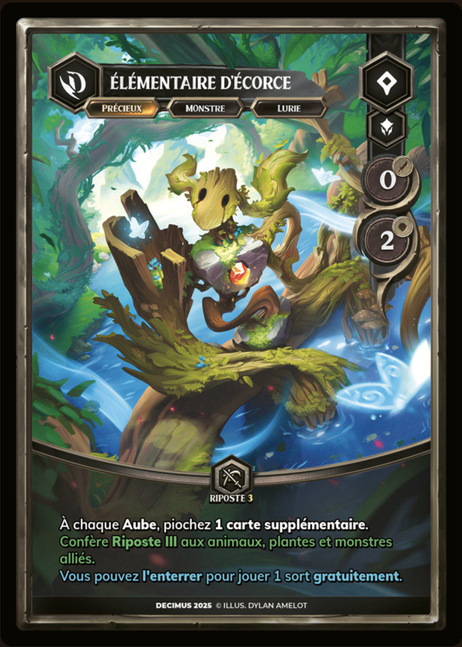 Élémentaire d’Écorce is a nature-bound creature rooted between wood, water, and magic. Formed from living bark and flowing energy, it embodies regeneration and quiet strength. Perched at the heart of a vibrant forest stream, it channels life through its core, sustaining both itself and its allies.