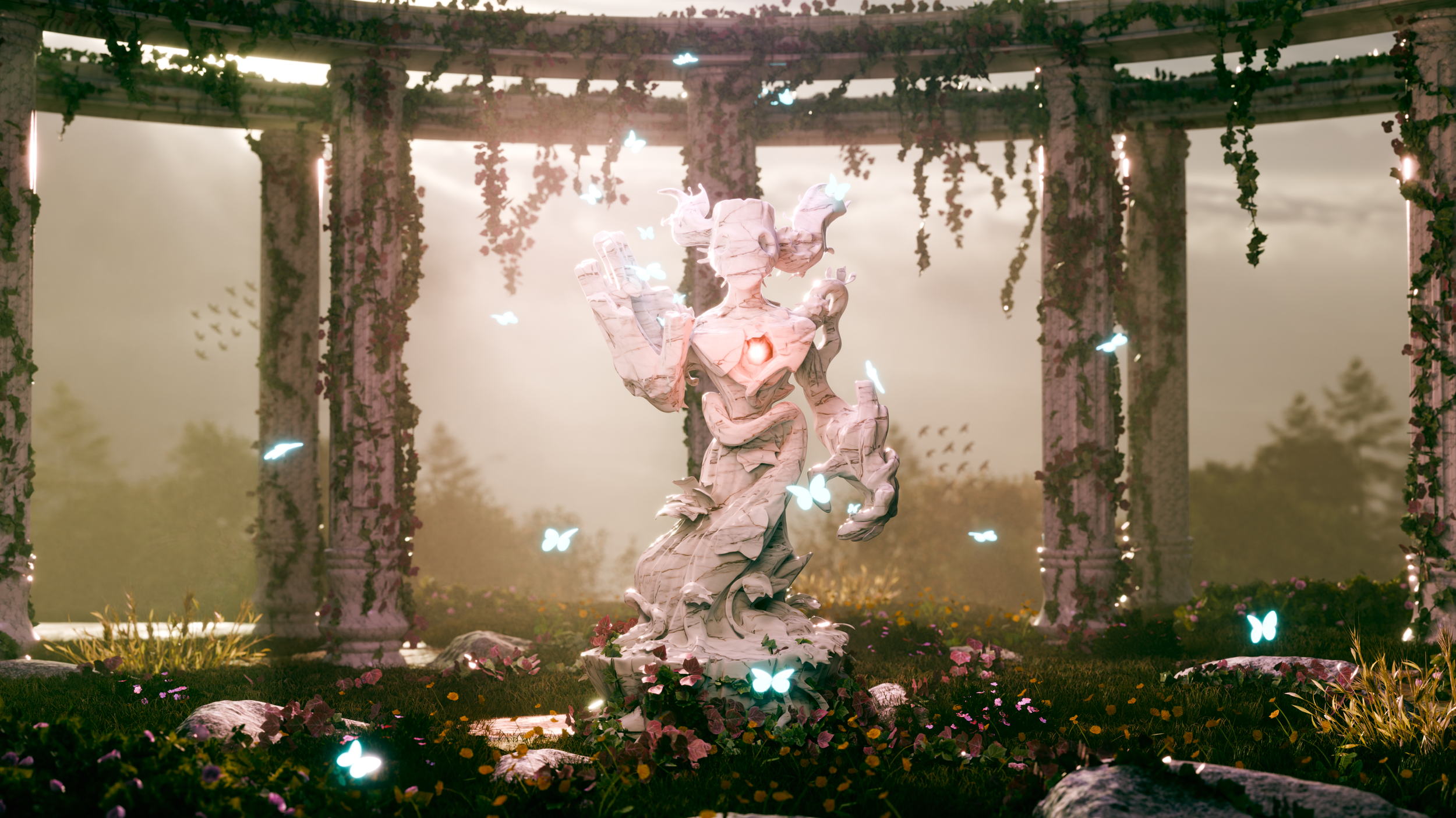 A sanctuary has been built in its honor, a place where people come to pray to nature itself. At its center stands a sculpted figure, a sacred representation of the elemental. Though carved in stone, it is not entirely lifeless: the glowing heart still pulses, and butterflies move through the space like living proof that nature endures.
