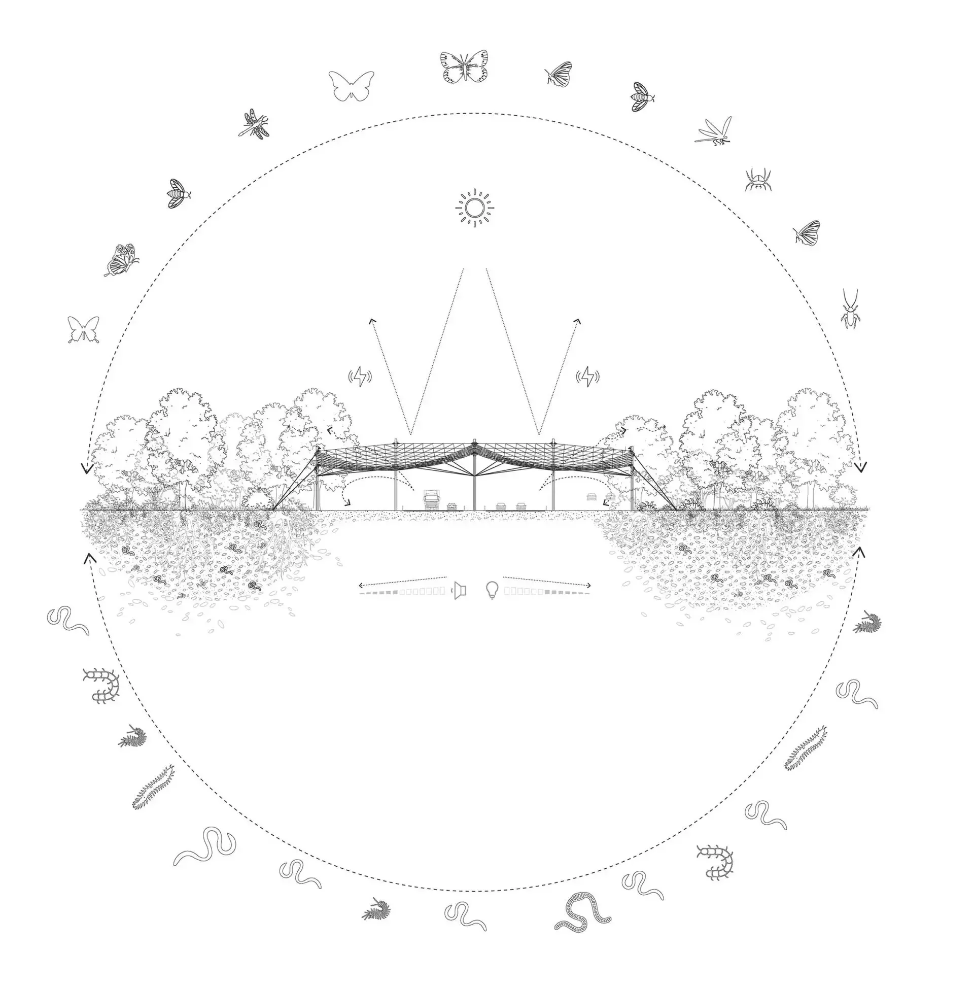 VenhoevenCS, DS, and Studio Solarix have jointly used their expertise, drive and creativity to develop a design for a sustainable future. They believe that designs aimed at tackling climate change and biodiversity loss should be nature-inclusive. They chose insects as the starting point for the project as working on the smallest scale can create the biggest impact. Insects create the biological foundation for all ecosystems and they are also an essential link in the food chain: 85% of our food is dependent on insect pollination. Building a treetop-level crossing for insects over the motorway can help to restore important natural connective routes.